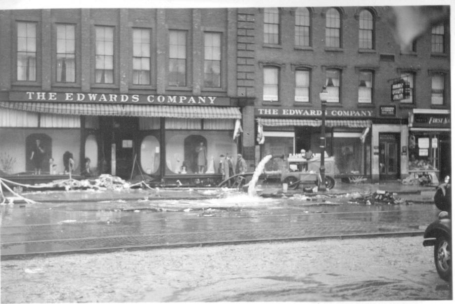 “Then I went on down, stopping at the Harrington factory, but that dam was behaving beautifully, taking care of everything that came through, with perhaps a foot or two to spare... Then I went on down - the only way to get to the factory was around Crane Street and down North - and then I could see that there had been a huge amount of water come down Central Street, and it had washed out a part of North Street. When I got down there, I saw that it had been running into our factory yard. I saw the American Optical Company’s main plant in the middle of a big lake, with water covering the tops of the basement windows...”