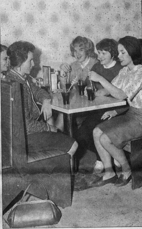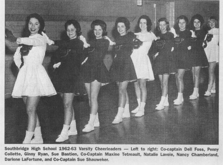 In the 1960s after school, SOF’s SPA on Central Street was the place to go. On this page is a picture of five very popular girls who graduated with Bruce Giovanello in the Class of 1963, having Cokes at SOF’s. Right to left sitting in the booth are; Connie Thomas L’Ecuyer, who teaches at West Street School; “Libby” Hall, co-captain of the basketball team; Sue Shauweker, co-captain of the cheerleaders; Carolyn “Squeak” Engelhardt, co-captain of the basketball team; and “Dell Fross,” co-captain of the cheerleaders and Class vice-president. They are drinking Cokes, but a lot of guys in those days were drinking orange “Crushes” because of them. A picture of the full 1963 cheerleading team is also featured on this page. The pretty cheerleader second from the right is Darlene LaFortune Kulesza who taught science at Wells Middle School.