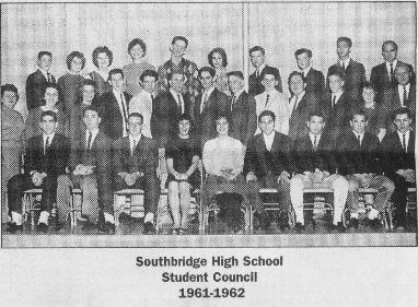 The Class of 1962 was the first class to graduate from Southbridge High. The Class of 1961 was the last class to graduate from the old Mary E. Wells High. In the Student Council picture on this page are some very familiar faces. In the third row, fourth from the right, is Bill Ryan. You could say he went from the Student Council to the Town Council. In the back row are two of Bruce Giovanello’s best friends as mentioned. Donnie Ferron is the first from the left, and Paul Mani is fifth from the left. Both are in the school’s Hall of Fame. Also in the back row, third from the left you will find Judy Polakowski Roscioli, who taught history at Mary E. Wells Middle School. In the first row, third from the right sits Attorney and Charlton Selectman Francis Fennessey. My friend Francis still sits next to me on occasion after all these years.