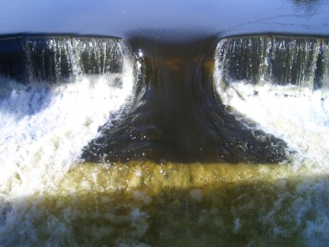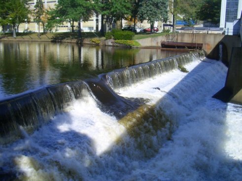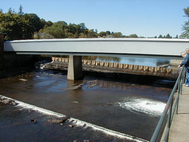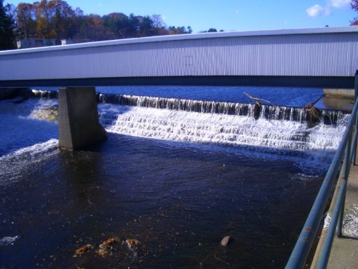 The first photo shows the walkway and wooden wall dam on the "AO Grounds" (Now Southbridge Business Center) . This was taken during the Summer of 2000, where little to no water is going over the Dam. While not always this dry, the rains of Oct 14 2005 provided Flooding conditions in Southbridge which resulted in the Dam breaking in two spots. This continues as of Nov 7th, with water pooring through the slots that were broken when the water broke the dam. The next photo was taken three weeks after the Oct 14th Flooding